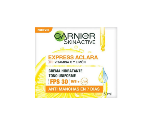La crema hiratante de de Express Aclara con extracto de limón y Vitamica C, aclara visiblemente las manchas en 7 días*, mientras la protege contra los rayos UV gracias a su factor de protección solar FPS 30.